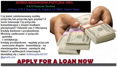 Oferujemy elastyczne pożyczki i finansowanie różnych projektów, dzięki czemu klient może uzyskać zwrot do 3%. Możemy zatwierdzić pożyczkę / gotówkę w wysokości do pięćdziesięciu milionów lub więcej, w zależności od kwoty, którą chcesz dla swojej firmy. Obecnie finansujemy: * Ekspansja komercyjna * Projekt nieruchomości komercyjnych * Pożyczki osobiste i pożyczki komercyjne, prosimy o kontakt.