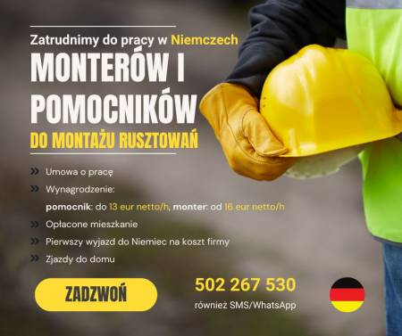 | Stanowisko: | Monterzy i pomocnicy do montażu rusztowań – Niemcy |